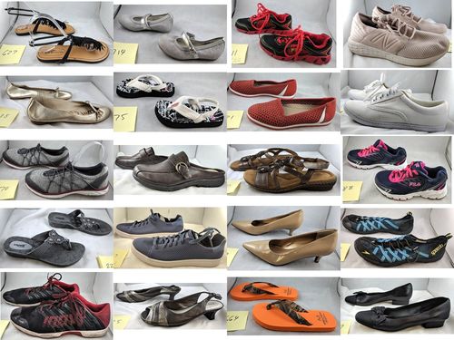 This lot features Assorted Shoes from Dr Scholl, FILA, Nina, Rockport, Vaneli & More. Mixed shelf pulls and customer returns. All shoes have been removed from boxes and polybagged as shown. Includes multiple brands. See the manifest for products breakdown.