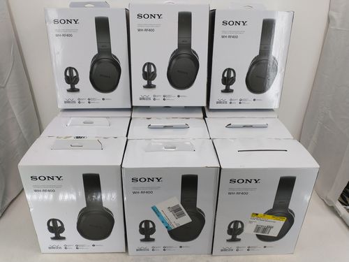 This lot includes Sony WHRF400 RF Wireless Headphones. Customer returns. May be missing accessories. Boxes have stickers, tape and are not in like-new condition.