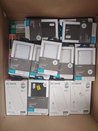 This lot contains 143 units of Speck Cases for Apple iPhone, Samsung Galaxy, LG, and more. All of the items are in used condition and may have signs of wears. See manifest for products breakdown.