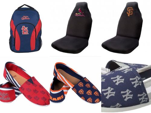 This lot includes MLB and NFL universal car seat covers, women's slip-on shoes and backpacks. All items are brand new and retail-ready.