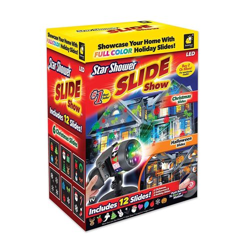 This lot includes 10 units of Star Shower New 2017 Slide Show Shower LEDs with different Christmas and Haloween Slides. All items are brand new and in retail packaging.