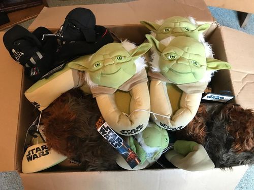 This lot is for 37 pair of Star Wars Slippers, sized for toddlers and youth. Characters include Yoda, Darth Vader, and Chewbacca. Toddler slippers have sock style ankles and the youth slippers are step in. Lightweight and easy to ship, each weighs under 1lb.