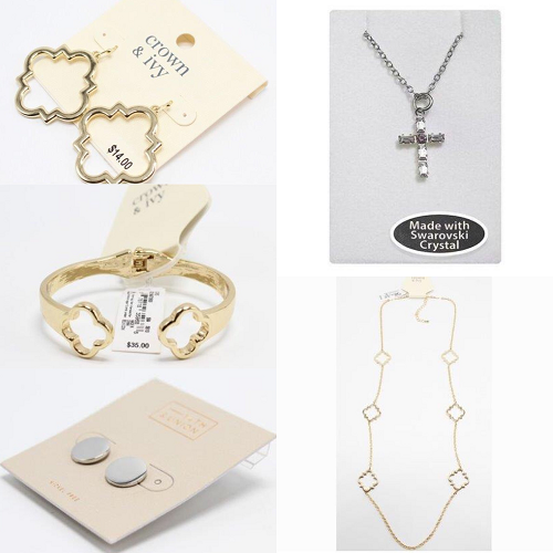 This stunning lot of new jewellery includes items from Swarovski, Crown & Ivy and 14 & Union! Perfect for the special people in your life! Swarovski Swarovski Crystal Cross Necklaces in Bible Gift Box (8), Crown & Ivy Crown & Ivy Long Gold Necklaces (8), Crown & Ivy Crown & Ivy Hinged Bangle Bracelets (8), Crown & Ivy Crown & Ivy Gold Ornate Drop Earrings (8), and 14th & Union 14th & Union Silver Button Earrings from Nordstrom Rack (8).