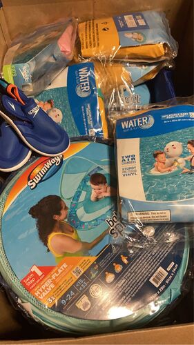 This lot includes multiple items that are designed to keep your baby/young child afloat and enjoy the pool/lake/water during the hot summer months. Multiple variations and sizes to fit multiple needs. Various other pool/summer items including Swim Tees/Rash Guards, Water Shoes, Life Vest and more. Perfect for summer sales! All items are in original packaging and ready for retail.