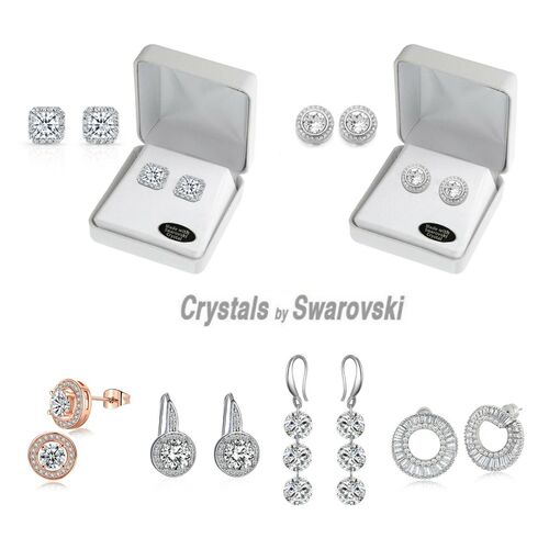 This lot includes 50 PAIR OF ASSORTED Swarovski Crystal Earrings in a Beautiful White Leatherette Gift Box. YOU RECEIVE 50 PAIRS OF ASSORTED EARRINGS. Great assortment Much MORE STYLES THEN PICTURED! EACH PAIR BEAUTIFULLY GIFT BOXED! PRE-PRICED AT 79.99 EACH. Both 14 kt Gold Overlay & Sterling Silver overlay. Buy now before they are all sold out! 100 % of the Jewelry has Swarovski Elements crystals in each piece. Ideal for reselling in your store or online. This lot includes Swarovski Elements - ( SWAROVSKI AUSTRIAN CRYSTALS) only. The jewelry itself is not from the Swarovski brand Excellent quality. This is the Best quality Jewelry we stock. Hypoallergenic post. Nickle + lead-free.