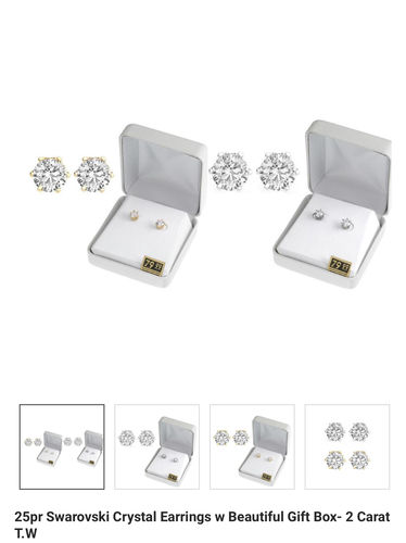 This lot includes 25 pieces of Swarovski Elements Crystal Earrings each comes with What Leather Box. Earrings are 2 Carats (6mm) set in a 6 prong basket setting. You will receive 12 Pairs in 14K Gold Overlay and 13 Pairs in Sterling Silver Overlay Each Retailing for $79.99. Please note, that these items contain Swarovski elements/crystals and are not from the Swarovski brand.