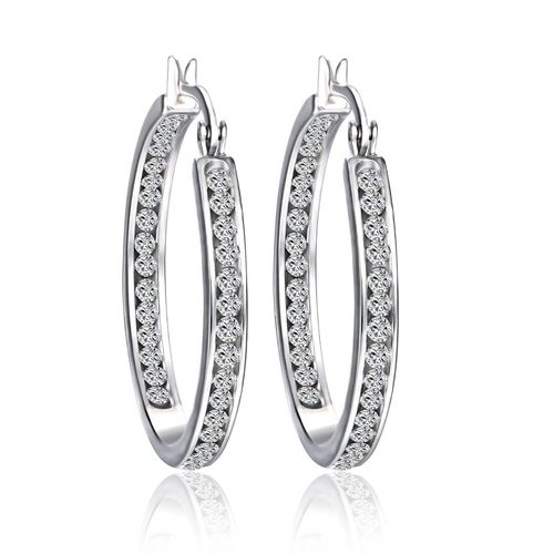 This lot includes Swarovski Elements Inside-Outside Hoop Earrings. Each Hoop measures 25 mm in size (approx size of a half dollar). Finish: Sterling Silver overlay. You will receive 30 pair earrings in Sterling Silver overlay.