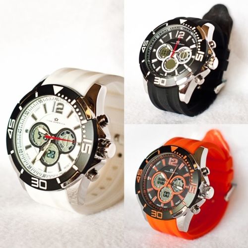 This lot includes 30 (10 White, 10 Black, and 10 Orange) units of Time America Professional & Heavy Duty Big Body Watches! This is the Time America Professional & Heavy Duty Big Body watch! Weighting 5 ounces these watches sport a 1-inch wide silicone band, stainless steel case with a Japanese Movement that is water-resistant up to 100 feet! The Time America signature timepiece is the perfect watch for the busy person in your life who also likes to make a statement. The Stainless Steel case and Heavy-Duty Silicone band offer the perfect level of support for this beautiful Analog and Digital watch. These watches make the perfect gift for anyone in your circle! All watches are Brand New and have never been sold to or worn by individual customers, and each comes with instructions. Battery life has not been tested, but the digital features are working as of this listing.
