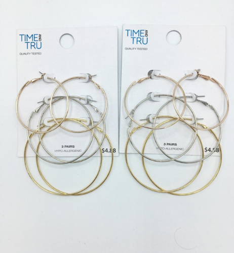 This lot includes Time and Tru 3 pair Hoop earrings. You will receive 250 cards of 3 pair hoops on card has shown. 3 hoops finish - Rose Gold, Sterling Silver &Gold. Hypo-Allergenic. All items are brand new.