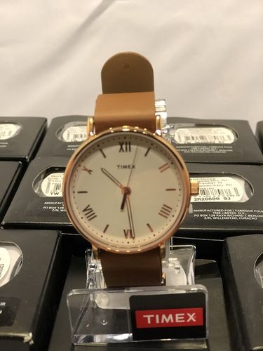 This lot contains 12 Timex Men's TW2R28800 Southview Tan/Rose Gold Watches! Adjustable tan 20mm genuine leather slip-thru strap fits up to 8-inch wrist circumference. Cream dial with partial rose gold-tone Roman numerals. Rose gold-tone 41mm brass case with mineral glass crystal. Luminous hands. Water-resistant to 30m (100ft): in general, withstands splashes or brief immersion in water, but not suitable for swimming or bathing. All watches are in their original packaging and their tags and battery savers have not been removed indicating they are still in working condition at the time of this listing.