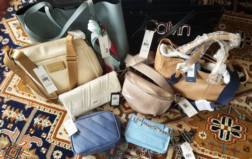 This lot includes totes, handbags (shoulder bags, crossbody bags, belt/convertible bags, convertible clutches, etc.) by Tommy Hilfiger, DKNY, Calvin Klein, Steve Madden, and I-N-C. All items are New with tags.
