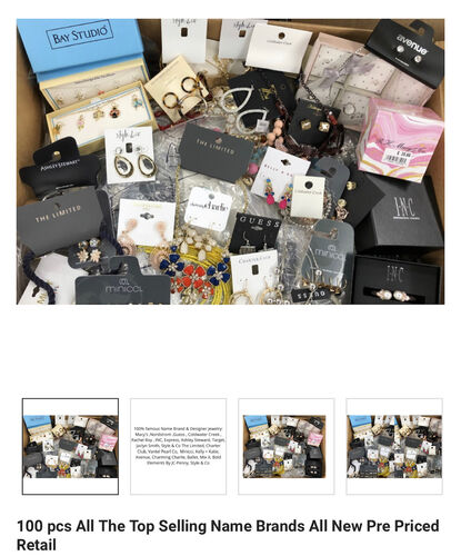 This lot includes 100 pcs All The Top Selling Name Brands All New Pre Priced Retail. Necklaces, Bracelets & Earrings & BOXED ITEMS ALSO. You will receive all these Designer and Name Brands below. 100% famous Name Brand & Designer Jewelry: Macy's, Nordstrom, Guess, Coldwater Creek, Rachel Roy, INC, Express, Ashley Steward, Target, Jaclyn Smith, Style & Co The Limited, Charter Club, Minicci, Kelly + Katie, Avenue, Charming Charlie, Ballet, Mix it, Bold Elements By JC-Penny, Style & Co etc. All new -All individually packaged or boxed. 100% of Each piece has the retail price and barcode.