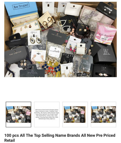 This lot includes 100 pcs of Top Selling Name Brand Jewellery. All The Top Selling Name Brands All New Pre Priced Retail. Necklaces, Bracelets & Earrings & BOXED ITEMS ALSO. You will receive all these Designer and Name Brands below. 100% famous Name Brand & Designer Jewelry: Macy's, Nordstrom, Guess, Coldwater Creek, Rachel Roy, INC, Express, Ashley Steward, Target, Jaclyn Smith, Style & Co The Limited, Charter Club, Minicci, Kelly + Katie, Avenue, Charming Charlie, Ballet, Mix it, Bold Elements By JC-Penny, Style & Co etc. All new -All individually packaged or boxed. 100% of Each piece has the retail price and barcode.