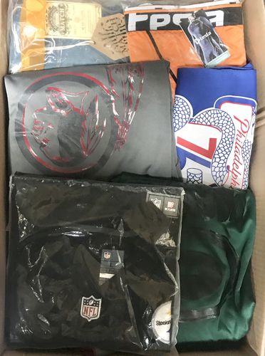 This lot includes Assorted Licensed sports apparel, workout clothing and accessories, and more by Telaleo, Spadehill, Mitchell & Ness, Smack Apparel, Fox Racing, And Many More. All units are shelf pulls. See the manifest for inventory breakdown.