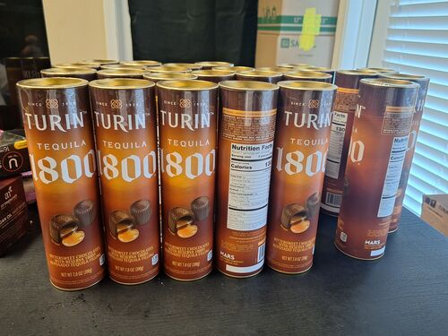 This lot includes TURIN TEQUILA 1800 BITTERSWEET CHOCOLATE CANDIES. THESE ARE 7 OZ CANS OF 1800 TEQUILA CANDY MADE BY MARS. THESE ARE NEW AND FACTORY SEALED.