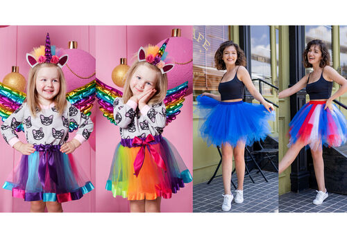 This lot includes TuTu Skirts for Women, Girls, and Ballet Skirts. B21110012: Features: tulle skirt, adjustable elastic waist, more fluffy and beautiful. Size: Regular Size Waist: 23.6-43.3 inches. Plus Size Waist: 33.4-55.1 inches; Length 18.8-19.6 inches, knee length. B21120002: Material: Tulle + Satin. Size Chart: S/M (2-5 years of age): Length 11". Waist: 8.5"-15.5", M/L(5-8 years of age): Length 12.5", Waist: 10" - 17.5". Wearing Advice: Wear It With Pur Color Clothes and A Pant Underneath Will Be Much Better.