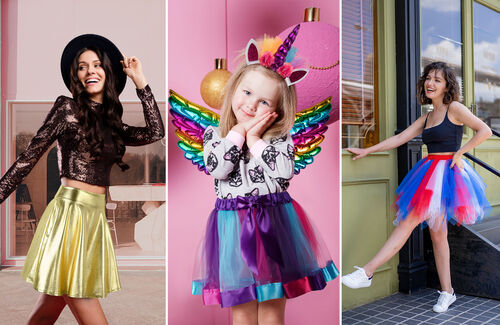 This lot includes TuTu Skirts for Women, Girl's Skirts, and Flared Skater Skirts. B21110012: Features: tulle skirt, adjustable elastic waist, more fluffy and beautiful. Size: Regular Size Waist: 23.6-43.3 inches; Plus Size Waist: 33.4-55.1 inches; Length 18.8-19.6 inches, knee length. B21120002: Material: Tulle + Satin. Size Chart: S/M (2-5 years of age): Length 11". Waist: 8.5"-15.5", M/L(5-8 years of age): Length 12.5", Waist: 10" - 17.5". Wearing Advice: Wear It With Pur Color Clothes and A Pant Underneath Will Be Much Better. B16110001: Material: 65%cotton + 35%polyester. Size: Waist: 27"-34" Length:17".