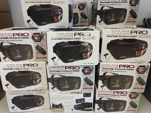 This lot includes Tzumi Dream Vision Pro Bluetooth Virtual Reality VR Headset Goggles. All units fully functional and in Like New or Very Good cosmetic condition. Most sets include a VR Headset, carrying pouch, micro USB, and extra earbuds. At least 25 sets include Bluetooth remotes. Manifest for this lot is 100%. There are: 23 in original box, 14 in carrying pouch only, and 66 in a nice brown box.