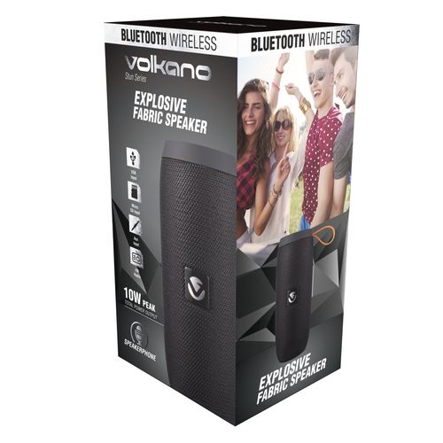 This lot features Volkano Stun series Bluetooth speaker. Bluetooth Version: V 4.1, Bluetooth Range: 10 m, Battery: 3 600 mAh, Charging Time: 3 – 4 Hours, Play Time: 1.5 – 2 Hours, Max Size for SD Card: 16 GB, Signal to Noise Ratio: 95 dB, Frequency Response: 50 Hz – 20 kHz, Total Power Output: 5 W RMS, Driver Size: 2", and Impedance: 4 Ω. INCLUDES: USB Charging Cable and Aux Cable.