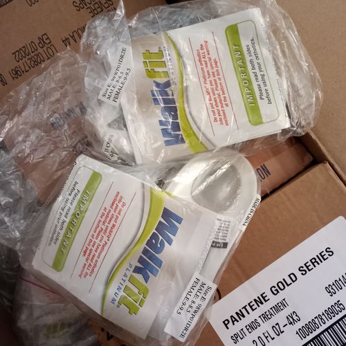 This lot contains 299 pieces. Multiple sizes of Walk Fit Platinum Orthotics. Dove men care deodorant, Vicks 44 severe, Pantene split end treatments, Crest 3D white toothpaste, and chrome colored shower rod expansion holders. Items with expiration dates are listed on the manifest. All items are new and retail ready.