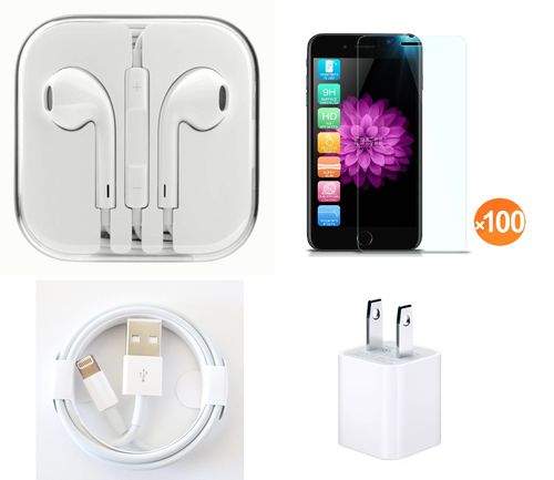 This lot includes different aftermarket Tempered Glass, USB Cable, Wall Charger Adapters, & 3.5 mm Earphone in white colour for iPhone devices with crystal packaging. All of the items are new and retail-ready.