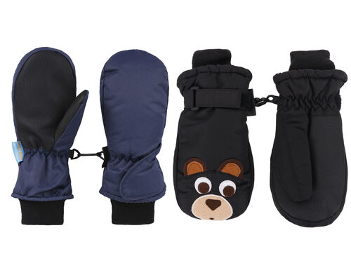 This lot includes Winter Kids Ski Gloves Snowboard Mittens. Material: Polyester Shell, 3M Thinsulate Insert. Sizes: Measure kids’ hands and match them to the ranges below. Toddler (1-2 years): under 4.5” from the bottom of palm to fingertips, glove length 7.75” with 2.35” woven cuff; glove width 3.25". XS (2-3 years): under 5” from the bottom of palm to fingertips, glove length 8.5” with 2.25” woven cuff; glove width 3.5".