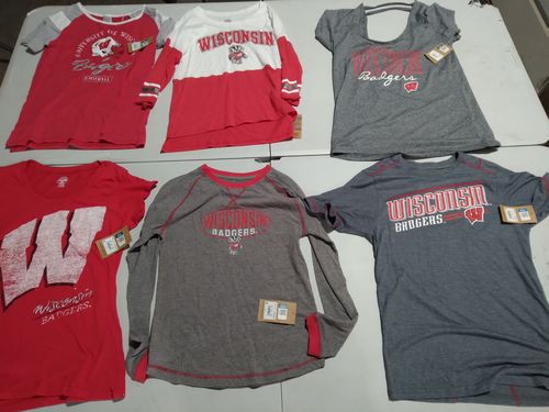 This lot features 65 pcs of Wisconsin Badgers Men's + Women's team apparel, all items are New and ship with tags attached. Please see the manifest and pictures for details.