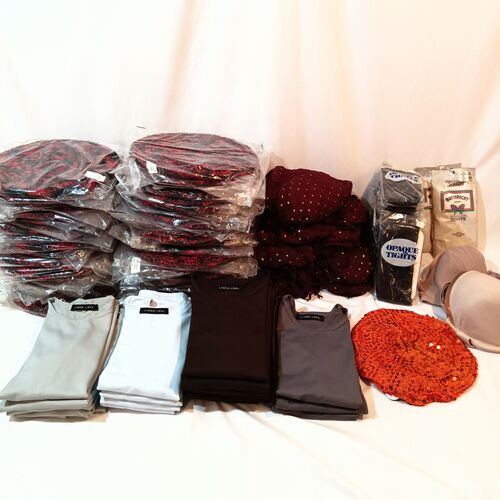 This lot (140) includes Linda Leal Sleeveless Shells NWT Tops. Assorted Sizes & Colors: Brown, Sage Green, Gray, Light Blue. Headwear: Beret Hats Adjustable One Size Fits All Bandanas Regular and Petit Size Tights Bras