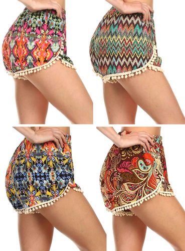 This lot includes 100 units of Women Pompom Tassel Trim Mini Shorts Pants in Assorted Sizes and Styles. All items are guaranteed to be authentic, brand new and ready for retail. Super cute printed summer short. Features pompom tassel trim and open flap sides. The elastic waistband makes stretchy and super comfortable. Casual fit design. Perfect for summer, travelling, beachwear and so on. Material: 100% Polyester. Size: M: Waist: 27”-36”, Hip: 41”, Inseam: 2.5", Length: 14.5”. L: Waist: 29”-38”, Hip: 42”, Inseam: 2.5", Length: 14.5”