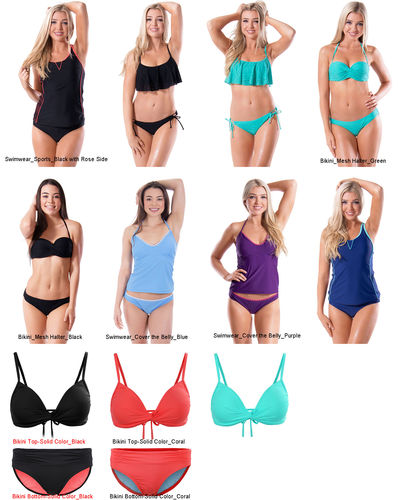 This lot includes Women's Bikini Swimsuit Swimwear. Solid Color: Material: 80%Nylon+20%Spandex, S: Chest: Adjustable, Minimum 23.5" Waist: 29.0"-32", M: Chest: Adjustable, Minimum 24.5" Waist: 31.5"-36", L: Chest: Adjustable, Minimum 25.0" Waist: 34.0"-39", XL:Chest: Adjustable, Minimum 26.0" Waist: 37.0"-41". Bikini_Mesh Harnesses, Material: Shell: 92% Nylon+8% Spandex; Lining: 80%Nylon+20% Spandex; 100% Polyester, XS: Chest: 20.5" Waist: 23", S: Chest: 22.5" Waist: 25", M: Chest: 24.5" Waist: 27", L: Chest: 27.0" Waist: 29", XL: Chest: 29.5" Waist: 32".