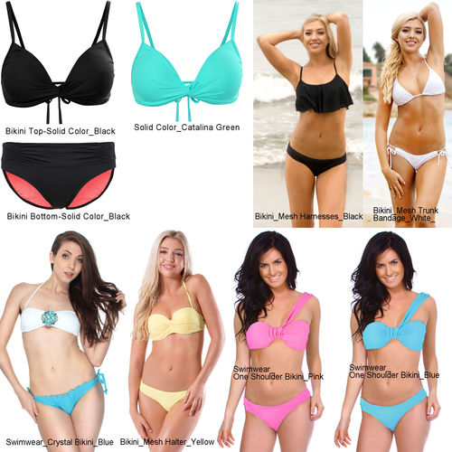 This lot includes Bikini Top-Solid Color. Material: 80% Nylon+20% Spandex, S: Chest: Adjustable, Minimum 23.5" Waist: 29.0"-32", M: Chest: Adjustable, Minimum 24.5" Waist: 31.5"-36", L: Chest: Adjustable, Minimum 25.0" Waist: 34.0"-39", and XL:Chest: Adjustable, Minimum 26.0" Waist: 37.0"-41". Bikini Bottom-Solid Color: Material: 80% Nylon + 20% Spandex. S: Chest: Adjustable, Minimum 23.5" Waist: 29.0"-32", M: Chest: Adjustable, Minimum 24.5" Waist: 31.5"-36", L: Chest: Adjustable, Minimum 25.0" Waist: 34.0"-39", and XL:Chest: Adjustable, Minimum 26.0" Waist: 37.0"-41". Bikini_Mesh Trunk Bandage: Material: Shell: 92% Nylon+8% Spandex Lining: 80% Nylon+20% Spandex; 100% Polyester. Size XS: Chest: Adjustable Waist:23", Size S: Chest: Adjustable Waist:25", Size M: Chest: Adjustable Waist:27", and Size L: Chest: Adjustable Waist:29". Bikini_Mesh Harnesses: Material: Shell: 92% Nylon+8% Spandex; Lining: 80%Nylon+20% Spandex; 100% Polyester; M: Chest: 24.5" Waist: 27".