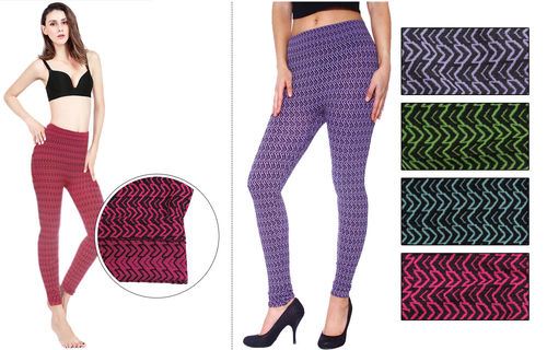 This lot includes assorted Women's Colored Chevron Print Texturized Leggings. Material: 90% Polyester; 10% Spandex. Size: Waist 28", Rise 10", Length 35". All measurements are approximate and taken before stretching; stretches 2-3 inches. See the manifest for inventory breakdown.