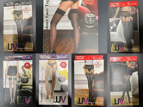 This lot includes 85 assorted pairs of thigh highs. All packaged are unopened and retail-ready.