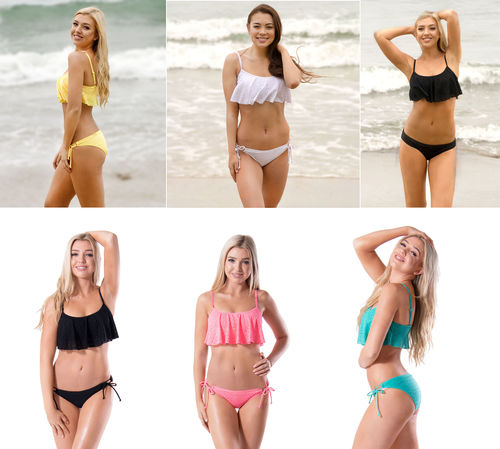 This lot includes Women's Sexy Mesh Ruffled Crop Bikini Set Designed in the USA. Includes moulded cups and an adjustable, tie-back halter neck strap. Material: Shell: 92% Nylon+8% Spandex; Lining: 80%Nylon+20% Spandex; 100% Polyester. XS: Chest: 20.5" Waist: 23". S: Chest: 22.5" Waist: 25". M: Chest: 24.5" Waist: 27". L: Chest: 27.0" Waist: 29". and XL: Chest: 29.5" Waist: 32".