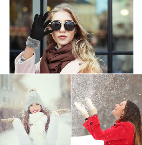 This lot includes Women's Three Fingers Touch Gloves. These womens gloves are soft and comfortable to wear. Ultra-soft wool blend & Interior cosy fleece lining Beautiful cable knit & ribbed design, which is elegant and simplistic, can match your various styles. Touchscreen Gloves: Easy & convenient 3 touchscreen fingers, you can better touch the screen of your smartphone, iPad, tablet as well as your car while driving without taking your hands out in freezing weather. Full coverage of your fingers, give your hands complete protection against chill in winter days. Elastic Cuff makes these women's knit gloves windproof perfectly. Perfect pair of cosy warm knitted winter gloves for hiking, camping, snowboarding, skiing, snow tubing, ice skating, sledging, and other outdoor activities, Simple & practical touchscreen sensitive fingers allow you to keep your gloves on while using various electronic touchscreen tablet of smartphone devices.