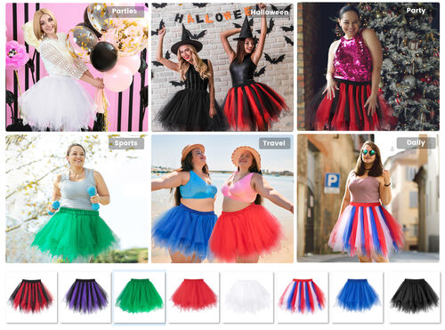 This lot includes Women's Tutu, Tutus Dance, and Halloween Christmas Skirts. Features: tulle skirt, adjustable elastic waist, more fluffy and beautiful. Size: Regular Size Waist: 23.6-43.3 inches, Plus Size Waist: 33.4-55.1 inches, Length 18.8-19.6 inches, knee length.