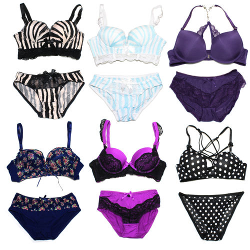 This lot includes 30 sets of Women's Underwire Boost Push Up Bras & Matching Lingerie Underwear Sets. Wild selections. Assorted sizes, bras 32-36 and cup A to D, panties S, M, L, the sizes fit most adult women. Material: lace, cotton, spandex. Packed well and organized, 30 sets, packed 3 matching sets per bag per style. Lady lace underwire boost push-up bra and panty underwear set, comfortable wear experience, suitable for daily wear for any purposes. You may receive more colors & styles in the lot than the display pictures. There are too many styles to be shown.