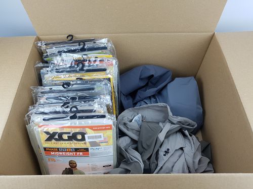 This lot includes XGO and Arc'teryx shirts, pants, and jackets in various sizes and styles. All of the items are brand new and in their original packaging.