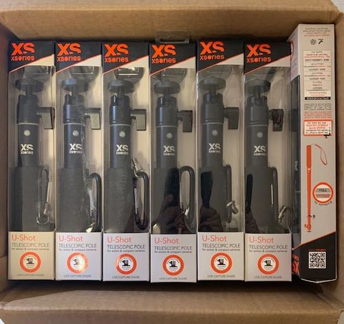 This lot includes 45 units of XSories U-Shot 19-in Telescopic Pole w/ 1/4-inch Mount and GoPro Adapter - Black by XSories. All items are retail ready in sealed hanging packages.
